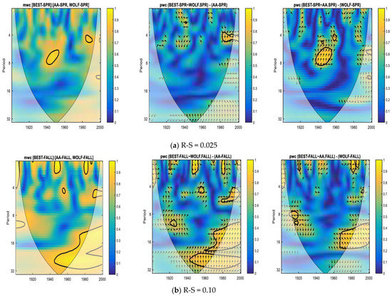 In Figure 5, where the results of the wavelet analysis for the BEST climate index are presented, it can be seen that for the first case, R-S low (0.025) in the spring season (Figure 5a), both mwc and pwc do not show significant coherence except for very isolated cases. On the other hand, for the autumn season (Figure 5b), it is observed that the two predictors considered together produce a greater coherence than if only one is considered and the other is excluded. This is especially true for the coherence corresponding to the double solar cycle (Hale’s cycle) and especially after the 1940s.