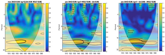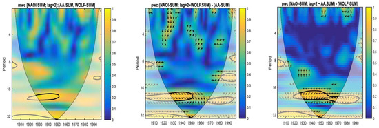 If we compare the coherences between summer NAOI with the two predictors at lags 2 and 3 (Figure 7 and Figure 8), it can be seen that both the aa and Wolf number contribute to the coherence obtained by mwc for periodicities around the double solar cycle, especially for the years 1930–1950.