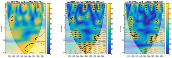 Mwc (left panel) between fall BEST at lag = 2, and the two predictors aa (AA) and Wolf Number (WOLF); partial wavelet coherence (pwc) between BEST and Wolf number, excluding the effect of aa (middle panel), and pwc between BEST and aa, excluding the effect of Wolf number (right panel).
