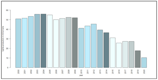 Lignite production (per million tons) in Western Macedonia from 2000 to 2020. Each bar in the barplot indicates the lignite production per year.
