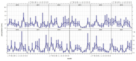 In accordance with the Hellenic National Meteorological Services (HNMS), the climate of Western Macedonia is mainly humid subtropical (Cfa), following the Köppen climate classification. Based on the climatic data for Kozani during the period 1955–2010, the monthly mean temperature ranged between 2.3 °C in January and 24.5 °C in July, while the minimum monthly temperature in January was −1.2 °C. The maximum monthly temperatures in July and August reached up to 29.6 °C. Figure 2 shows the average daily precipitation values for the center of the basin. The precipitation values were taken from the climate data storage of the Copernicus climate change service. Lower-than-average concentrations were measured during precipitation events. A detailed analysis of the climatological conditions in the regions of Florina, Kastoria, and Kozani is provided by Zoras et al. [30].