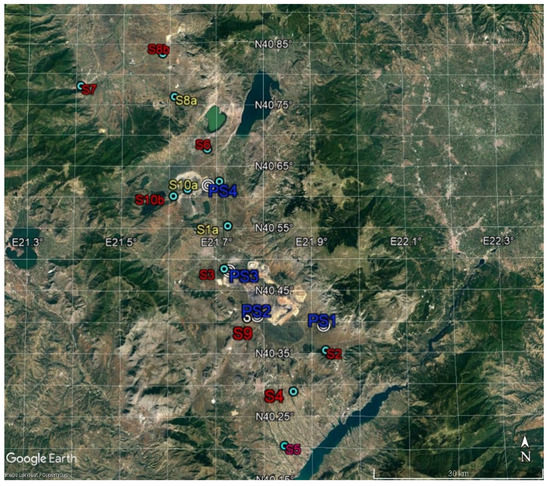Figure 3 displays the location of stations and Table 1 shows the coordinates and altitude of each station. The second dataset consists of the concentrations of 17 PM2.5-bound and 17 PM10-bound trace elements (Al, Mn, Fe, Ni, Cu, Zn, Sn, Pb, Si, Mg, Cr, As, Na, K, Ca, Sr, Cd) of 72 samples from 2 locations (36 samples of PM10 and 36 samples of PM2.5). The sampling was carried out for a period of 12 months (December 2017 to November 2018) for 24 h ambient sampling. The samples were collected in the industrial area of the open-cast mines near the village of Pontokomi and in the rural area of the village of Petrana. These two receptor sites have different characteristics. Specifically, the distance of Pontokomi from the lignite-fired power plant “Kardia” is 2.5 km, while Petrana has a distance of 12.5 km from the lignite-fired power plant “Agios Demetrios”.
