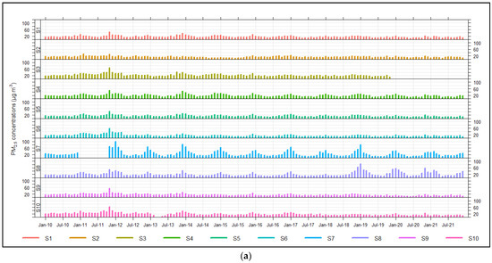 Figure 4a,b show the monthly mean concentrations time series of PM2.5 and PM10 measured during the study period (2010–2021) at all AQMS of the region. At all AQMS there are clear seasonality patterns for PM2.5 concentrations, with high levels during the cold period and low levels during the warm period. Besides the operation of lignite-fired power plants and mining activities, major contributors to high PM2.5 concentrations during the winter period are the heating systems, residential wood combustion, and biomass burning. The AQMS are located in the broader area of the lignite basin, so they capture various sources of PM release (e.g., traffic emissions), not necessarily related to the mining and power generation [15]. In contrast to PM2.5 concentrations, the monthly mean values of PM10 concentrations reached the highest values during the winter months at the AQMS of Florina (S7) and Vevi-Meliti (S8), while the highest monthly mean concentrations of PM10 were registered during the summer or autumn at the other AQMS. In general, the highest monthly mean values were calculated in August at the AQMS in Oikismos (S3) and Anargyroi (S10) based on the monthly mean values over the 12-year period. However, the highest mean monthly PM10 concentrations were registered at the AQMS of Anargyroi (S10) in September 2011 (mean monthly value: 134 μg/m3) and at the AQMS in Oikismos (S3) in July 2012 (mean monthly value: 112 μg/m3).