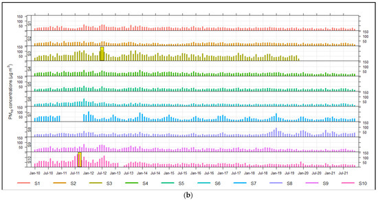 Monthly mean concentrations time series of (a) PM2.5 and (b) PM10 concentrations (μg/m3) measured during the study period (2010–2021) at all AQMS of the region. In (b), the months with the highest monthly mean concentrations of PM10 in AQMS S3 and S10 are indicated with yellow.