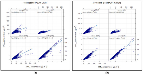 Linear regression equations for each season yielding a best-fitting straight line for PM2.5 to PM10 at the AQMS of (a) Florina and (b) Vevi-Meliti for the study period (2010–2021).
