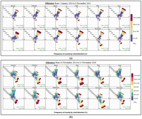 It is evident that PM levels are associated with wind speed and direction, as well as PM, which can be transported by the wind, affecting neighboring areas. In Figure 6a,b, the monthly pollution increases for PM10 concentrations in Oikismos during two different periods are shown. From 1 January 2010 to 9 November 2014, the air quality station was at a distance of 650 m from the lignite power plant of Ptolemaida, while for the period from 10 November 2014 to 13 November 2019 after a fire in a plant’s unit, the lignite power plant shut down. During the first study period, the higher concentrations of PM10 were indicated during the summer months and the prevailing winds were mainly NNE-NE (Figure 6a). During the second study period, the highest PM10 concentrations were observed under the influence of SSE-SE and SE-ESE wind directions, while low PM10 concentrations were observed for northerly winds (Figure 6b).