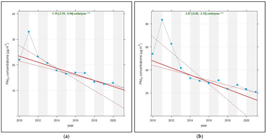Trends in (a) PM2.5 and (b) PM10 at Anargyroi AQMS. The plots show the deseasonalized annual mean concentrations of (a) PM2.5 and (b) PM10, with blue lines and squares. The solid red line shows the trend estimate and the dashed red lines show the 95% confidence intervals for the trend. The overall trend is shown at the top along with the 95% confidence intervals. The *** show that the trend is significant to the 0.001 level.
