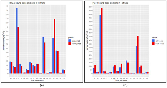 Concentrations of (a) PM2.5-bound and (b) PM10-bound trace elements at Petrana during the warm and cold period of the year.