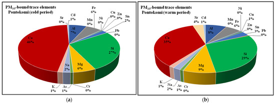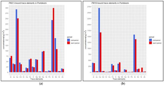 Concentrations of (a) PM2.5-bound and (b) PM10-bound trace elements at Pontokomi during the warm and cold period of the year.