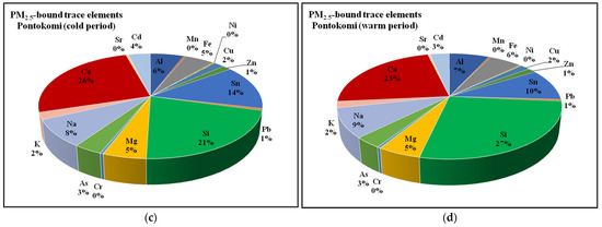 Pie charts for the percentage contribution of trace elements to (a) PM10 in the cold period, (b) PM10 in the warm period, (c) PM2.5 in the cold period and (d) PM2.5 in the warm period at Pontokomi.