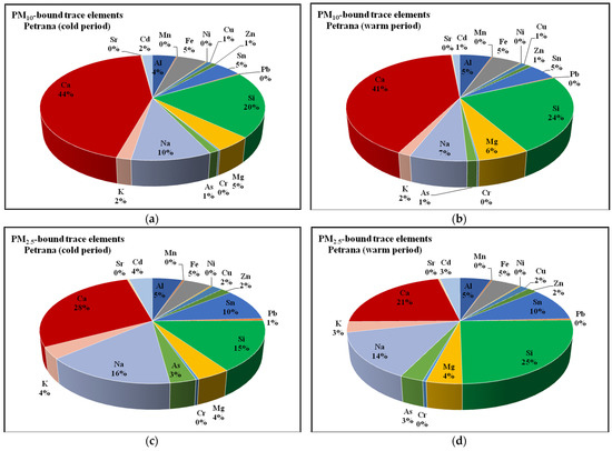 Pie charts for percent contribution of trace elements to (a) PM10 in the cold period, (b) PM10 in the warm period, (c) PM2.5 in the cold period, and (d) PM2.5 in the warm period at Petrana.