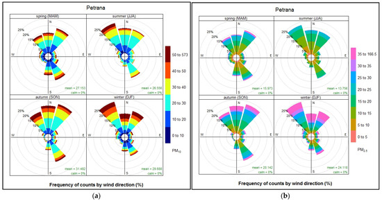 Figure 12a,b display the seasonal pollution increases for PM10 and PM2.5 concentrations in Petrana, respectively. The highest PM concentrations were found during autumn and winter. In general, wind data were mainly from the direction between NW-NNW and N-NE, as well as SE-SSE, while much of the higher PM concentrations were associated with Northerly winds.