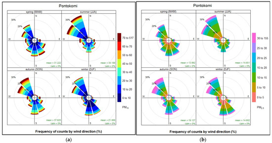 Figure 13a,b display the seasonal pollution increases for PM10 and PM2.5 concentrations at Pontokomi, respectively. In contrary to pollution increases for Petrana, at Pontokomi the seasonal variability is not clear given that relatively high concentrations were indicated throughout the year while high concentrations were also found during summer. In general, wind data were mainly from the directions WNW-NNW and S-SE. Much of the higher PM concentrations were associated with winds from the WNW-NNW direction in summer and autumn. For PM2.5, the contribution of S-SE in autumn is substantial, with much of the higher PM2.5 concentrations associated with both S-SE and WNW-NNW wind directions. Pontokomi is affected by the operation of two mines, located to the north and east, and by the lignite-fired power plant “Kardia”, which is located to the east. The South Field mine, which is the largest in the area in terms of total excavations, is also located east of Pontokomi but at a further distance than the Kardia mine and power plant [15].