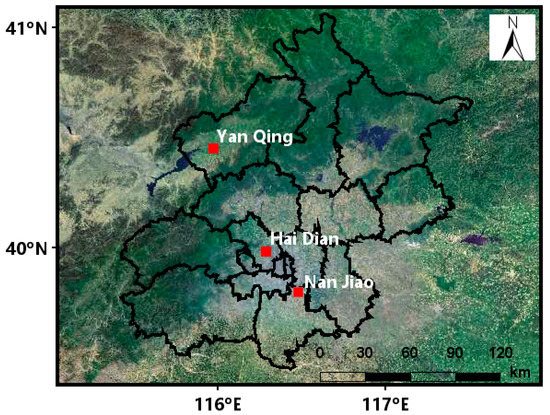 Beijing is located in the North China Plain, respectively surrounded by the Yanshan and Taihang Mountains on the north and west sides. The three sets of lidar are located in Yanqing, Haidian, and Nanjiao of Beijing. The specific locations of the lidar are shown in Figure 1. Yanqing station has a higher terrain and a relatively good ecological environment. Haidian station and Nanjiao station are typical urban environments with many vehicles and frequent human activities.