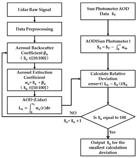 For the calculation of the lidar ratio, it was assumed that the lidar ratio of aerosol gradually increased from 10 sr to 100 sr with an increment interval of 1 sr in the process of retrieving the AOD from lidar data. Then, the optical depth of atmospheric molecules was subtracted from the AOD obtained by the sun photometer. Finally, the estimated lidar ratio corresponded to the minimum relative deviation of the AOD measured by the lidar and the sun photometer. The specific calculation process is shown in Figure 2.