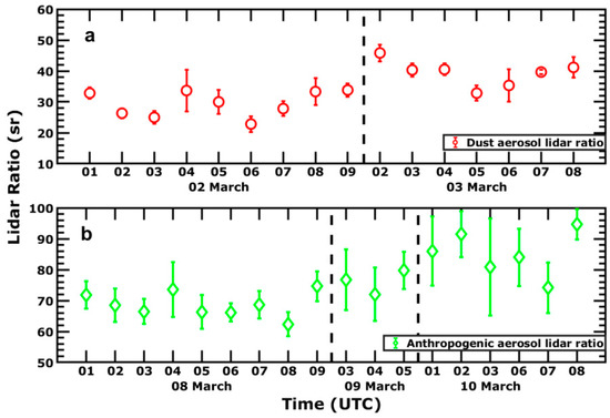 In Figure 3, it is shown that the average lidar ratio from 2 to 3 March was 34 ± 3 sr, and the lidar ratio was small due to the impact of dust; this is also consistent with the previous study in which Beijing had a lidar ratio of 36.2 ± 4.7 sr during the period of dust [27]. The average lidar ratio from 8 to 10 March was 75 ± 7 sr, which is relatively large. Note that a lidar ratio that is greater than 60 sr is often affected by anthropogenic aerosols [28].