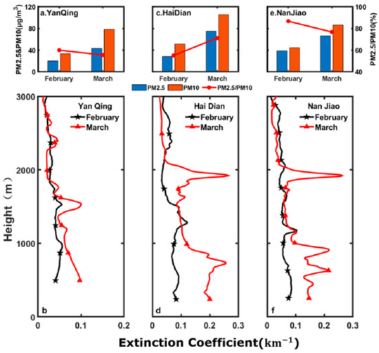 In order to further study the pollutant concentration and the vertical distribution of aerosols in different regions during the Winter Olympics, the aerosol extinction coefficient and PM data of each site were averaged monthly. It can be seen from Figure 4a,c,e that the average value of the PM2.5 and PM10 data of each region is greater in March than that in February, which may be related to the multiple occurrences of aerosol pollution events in March. The PM2.5/PM10 ratio of 50% is the dividing line between natural pollution and manmade pollution [29,30,31]. The ratio of each station area in February and March has always remained above 55.17%, and the highest it reached was 86.77%. This reflects that the Beijing area is mainly affected by anthropogenic pollution, and the concentration of fine particles pollutants is relatively high. In addition, there are differences in the spatial distribution of the ratio of PM2.5/PM10. Among them, the ratios of Haidian and Nanjiao are higher than 70%, which is closely related to the dense population and serious anthropogenic pollution in Haidian and Nanjiao.