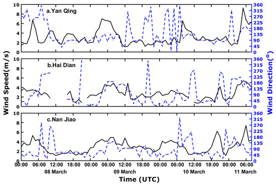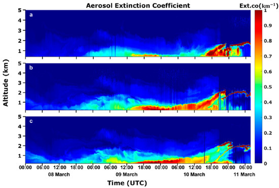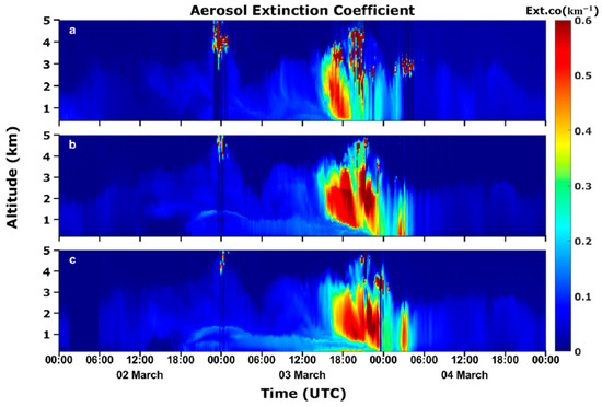 Three lidars in Beijing simultaneously monitored an aerosol pollution event from 2 to 4 March. As shown in Figure 5, the aerosol layer with an extinction coefficient of 0.6 was observed at the three stations at the same time from 15:00 to 16:00 on 3 March, indicating that there was a high concentration of pollutants entering the Beijing area at this time. The bottom of the aerosol layer in Figure 5b Haidian and Figure 5c Nanjiao were about 1 km high. Due to the high altitude of Yanqing in Figure 5a, the bottom of the aerosol layer was about 0.6 km. At 16:00, there was a low wind speed in the Beijing area (the wind speeds in the three regions of Figure 8a–c were about 2 m/s), and the aerosol layer began to sink gradually. At 0:00 on 4 March, the extinction coefficient of aerosol in Yanqing dropped to a minimum value of 0.17 . At 02:00 on 4 March, the aerosol extinction coefficients in Haidian and Nanjiao dropped to the minimum of 0.3 , indicating that the aerosol imported from outside area had settled to the ground and mixed with local aerosols. Beginning at 02:00 on 4 March, there was a relatively high wind speed near the ground in the Beijing area (the minimum wind speed in the three regions of Figure 8a–c was about 16 m/s), and the near-ground aerosol was rapidly diffused into the air; afterwards, the extinction coefficient of the aerosol in Yanqing was 0.23 . At 03:00 on 4 March, the aerosol extinction coefficients in Haidian and Nanjiao were about 0.49 , and the high wind speeds promoted the diffusion of pollutants near the ground. Then at 04:00 on 4 March, the near-ground extinction coefficient in the Beijing area reached the minimum value, about 0.09 .