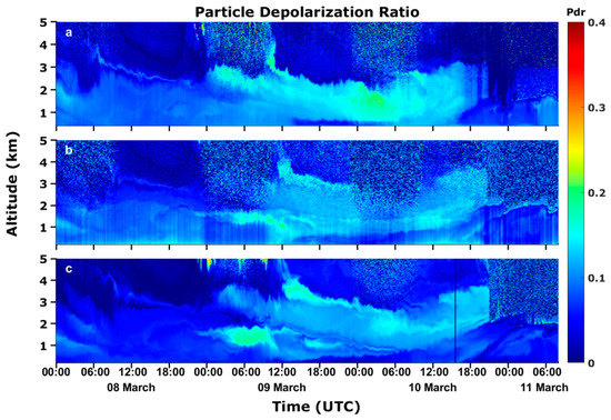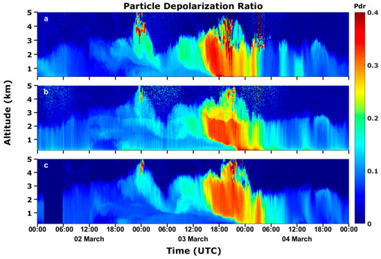 In Figure 6, the depolarization ratios of particles in the three regions were between 0.15 and 0.35 during 2–4 March, indicating that the shape of aerosol particles tends to be non-spherical. In particular, from 15:00 on 3 March to 03:00 on 4 March, the particle depolarization ratio of the aerosol layer usually exceeded 0.26. During aerosol pollution events, the depolarization ratio of particles greater than 0.2 can be considered as dust particles [13]. The particle depolarization ratios of dust and polluted dust are 0.2–0.42 and 0.15–0.26, respectively [32].