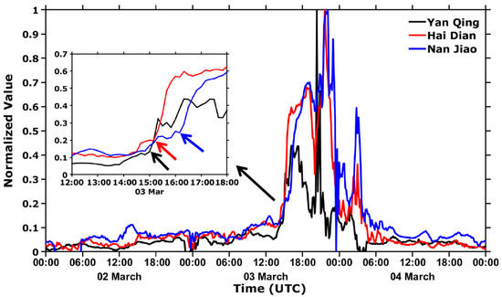 By enlarging the normalized profiles from 12:00 to 18:00 on 3 March, it is found that the extinction coefficients of the three regions all suddenly increased at a certain time node, indicating a moment of a large amount of aerosol input. It can be observed from the enlarged map that the time points of the sudden increases in different regions show a discrepancy. In particular, the time sequence is Yanqing–Haidian–Nanjiao, which also corresponds to the location of the three lidars from northwest to southeast. By combining this time sequence with the related geographical location characteristics, it can be preliminarily deduced that the input air mass of this aerosol originated in the west or north of Beijing. As shown in Figure 8, the frequent occurrence of western or northern winds during the whole aerosol pollution process can also reasonably explain this conclusion.