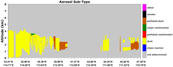The CALIPSO satellite was launched from Vandenberg Air Force Base in California in 2006. It carries three instruments with zenith fields of view (CALIOP, IIR, WFC), which are mainly used to detect the vertical structure and characteristics of global clouds and aerosols, study the role of clouds and aerosols in regulating the Earth’s climate, and study the interaction between them [21,22]. This paper uses the V4.20 version of the aerosol-type feature stratification product from the CALIPSO L2 data, which is available at NASA Langley Research Center (https://search.earthdata.nasa.gov/, accessed on 4 March 2022).