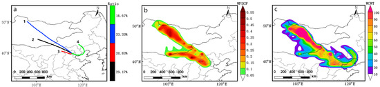 Figure 10a shows the probability of occurrence of 24 h backward trajectory clusters 1–4, which are 33.33%, 29.17%, 20.83%, and 16.67%, respectively. Most of the trajectories come from Mongolia and Inner Mongolia. As shown in Figure 10b,c, WPSCF shows that the most probable source regions are mainly concentrated in Mongolia, Inner Mongolia, and Hebei–Shanxi border areas with WCWT values higher than 60 µg/m3, indicating that the corresponding regions contributed a large amount of PM10 to the pollution in Beijing.