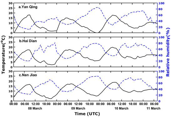 Temperature and humidity on the surface of each region ((a) Yanqing, (b) Haidian, and (c) Nanjiao).