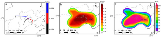 Figure 15a shows the probability of occurrence of 24 h backward trajectory clusters 1–3, which are 18.06%, 40.28%, and 41.67%, respectively. Most of the trajectories come from Tianjin, Bohai Bay, and southern Hebei in the east and south of Beijing. As shown in Figure 15b,c, WPSCF shows that the most probable source regions are mainly concentrated in southeastern Beijing, southern Hebei, and Tianjin with WCWT values higher than 100 µg/m3, indicating that the corresponding regions contributed a large amount of PM2.5 to the pollution in Beijing.