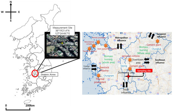 - National Institute of Environmental Research (NIER). 2020 Annual Report of Intensive Air Quality Monitoring Station, NIER-GP2020-208; NIER: Incheon, Korea, 2021. [Google Scholar]