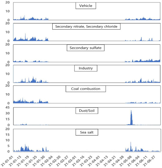 Chicago/Turabian StyleHan, Sang-Woo, Hung-Soo Joo, Hui-Jun Song, Su-Bin Lee, and Jin-Seok Han. 2022. "Source Apportionment of PM2.5 in Daejeon Metropolitan Region during January and May to June 2021 in Korea Using a Hybrid Receptor Model" Atmosphere 13, no. 11: 1902. https://doi.org/10.3390/atmos13111902
