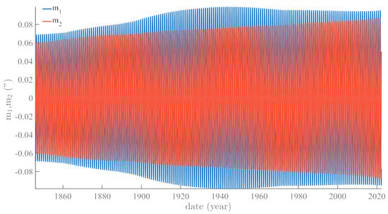 Many studies (e.g., [,,]) attempt to relate forced (annual) oscillations to polar motion RP (, ) or length of day (lod) (data file EOPC01IAU2000, [], maintained by IERS, https://www.iers.org/IERS/EN/DataProducts/EarthOrientationData/eop.html, accessed on 12 October 2020). The data are shown and discussed in []. The annual iSSA components of  and  are displayed in Figure 1. Both undergo some amount of modulation. That modulation is significant for , particularly between 1850 and 1930. For , it is smaller and more regular. An  vs.  diagram (see Appendix A) shows the classical Lissajou elliptical shape of annual polar motion. Note that the date of 1930 is when the Chandler wobble undergoes a phase jump of  (e.g., [,]). The lod data start only in 1962 (not shown, see []).