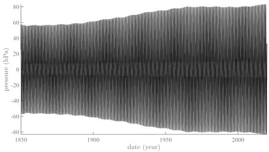 The pressure data are maintained by the Met Office Hadley Centre (https://www.metoffice.gov.uk/hadobs/hadslp2/data/download.html, accessed on 10 October 2020) and can be accessed as maps of global pressure, every month from 1850 up to the present. The sampling is 5× 5; the data we use are labeled HadSLP2r. Allan and Ansell ([]) built this series starting with ground observations whose number and location are shown in their figure 2. These are subjected to a quality check, corrected for various local effects, then homogenized with the empirical mode decomposition (EMD) filter.