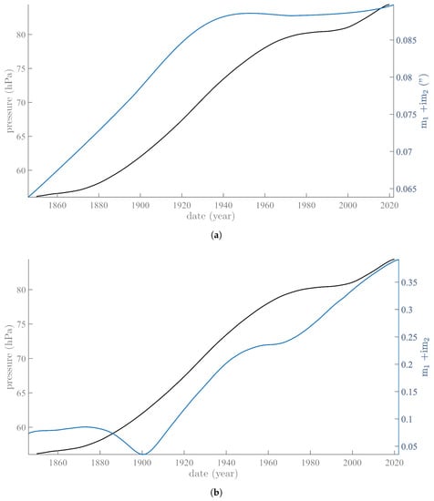 Using the Hilbert transform, we have determined the envelopes of the two annual components of polar motion and atmospheric pressure (Figure 4a). Polar motion clearly leads pressure by at least 40 years. In Figure 4b, we see that the trend of polar motion is close to the envelope of pressure, in general preceding it slightly. Given the mathematical properties of the Liouville–Euler set of equations, the potential direction of causality between the two phenomena is in the sense of polar motion leading atmospheric pressure. If correct, this is an important result that confirms Laplace’s statements in his 1799 Traité de Mécanique Céleste (volume 5, chapter 1, page 347) [].