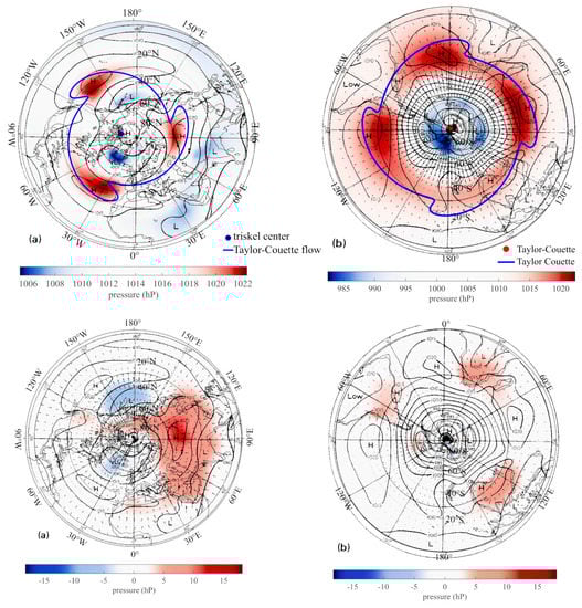 Overlay of the triskeles patterns (SSA trend, top) and SSA annual oscillation of SLP (bottom) from Lopes et al. (2022) with maps from Lamb (1972) page 157, Figures 4–13. Left, southern hemisphere; right, southern hemisphere. Lamb’s maps are calculated for a time span of 40 years; our SSA results are for 170 years.
