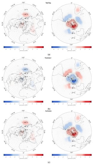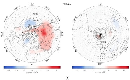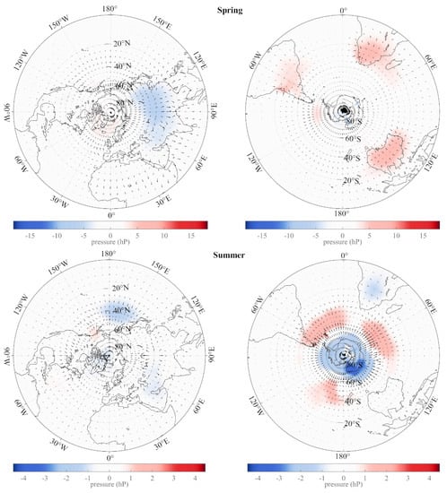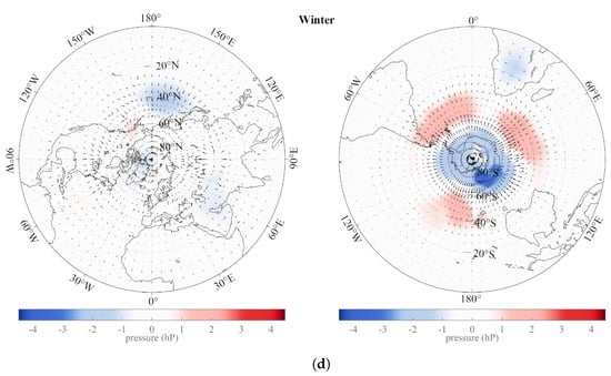 In Figure 6a–d, in the spring SH, there is, in addition, a very regular pattern at the intersections of the 20 S to 50 S annulus and the southern tips of the three southern continents (Africa, Australia, and South America). There is a smaller dipole with its negative part centered almost perfectly on the South Pole and its positive part centered on 70 S, 105 W. In the fall, the pattern is the same but with a reversal in sign. In the summer, there is a positive band between 15 and 25° S latitude from Madagascar to New Caledonia (40°–170° E) and a small negative spot near the South Pole (winter is the same with a sign reversal). The positive annulus is actually also seen, much weaker, in the Atlantic and Pacific oceans. The NH is rather different in the spring, with a large negative area over Asia from the Red Sea to Japan and extending in latitude from 80 N to 15 N. This large “anomaly” (using geophysical language) extends negative arms towards Senegal and over the western USA. Over the year, the “anomaly” changes sign. Still, in the summer, there are two sizable positive anomalies over the northern Atlantic and Pacific Oceans between 40 N and 60 N. In the SH, the large mean annual pressure variations occur over the southern continents; in the NH, the Asian continental “anomaly” dominates, although two significant features occur over the northern parts of the oceans. Because the Asian “anomaly” and the two (opposite sign) anomalies in the North Atlantic and Pacific are separated by almost 180° in longitude, their maxima being always in phase, their contributions to the seasonal excitation function tend to cancel [].