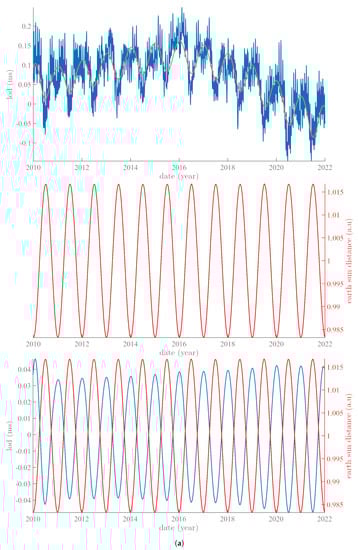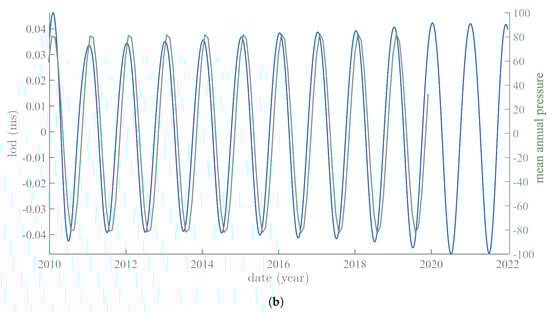 The seasonal change in sign agrees with changes in the Sun–Earth distance. The present values of the ellipticity of the Earth’s orbit and the obliquity of its rotation axis lead to changes of orbital velocity with summer in the southern hemisphere at perihelion and summer in the northern hemisphere at aphelion. As discussed in [,], forces acting on the polar axis do so through a torque (, ), obeying the Liouville-Euler system of equations (from Laplace (1799) []). The influence of these torques is in quadrature with the length of day (lod). Changes in orbital velocity of our planet lead to a variation in the solar torque, which acts against the sense of rotation of the planet. At perihelion, orbital velocity is 30.29 km/s and at aphelion 29.29 km/s. The torque associated with the Sun changes as this velocity changes. Thus, annual variations in lod should be in opposition to changes in the Sun–Earth distance, and they are (Figure 9a, bottom). In the northern latitudes, both the Earth’s rotation and the winds go from west to east, the Earth’s rotation slows in summer and accelerates in winter, hence there are positive pressure anomalies in winter, negative in summer. In other words, the pressure anomalies are due to the variation in rotation velocity (tracked through lod changes and winds). The phase difference between the annual components of lod and SLP is constant at 32 ± 1.2 days (Figure 9b). Relative variations of amplitudes should be similar, and indeed they are (Figure 9b).