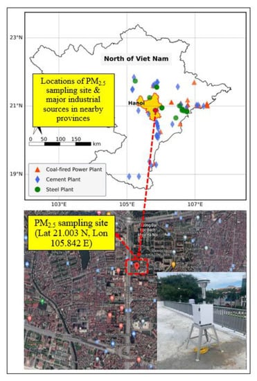 In the present study, the PM2.5 sampling site was situated on the roof of the two-floor building of the Hanoi University of Civil Engineering, 55 Giai Phong Road, Hai Ba Trung District in Hanoi (Figure 1). The sampling site (Lat 21.003 N, Long 105.842 E) was considered as an urban mixed site that was impacted by various anthropogenic sources such as motor vehicle emission, construction activities, and nearby industrial activities. There are many significant anthropogenic emission sources in the areas surrounding Hanoi, such as the steel, cement, and coal-fired power plants which are situated in the east, southeast, and north directions (Figure 1). When wind is blowing from these directions, air pollutants originating from those sources could be transported to the study area in Hanoi [10].