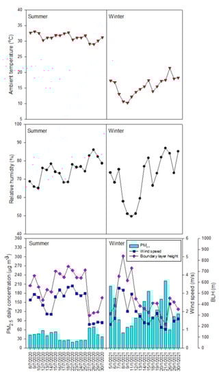 With respect to the seasonal meteorological conditions (Table 1), the average values for daily wind speed, boundary layer height, ambient temperature, and relative humidity estimated for the summer period were about 1.31, 1.26, 2.02, and 1.06 times higher than the counterparts for the winter period. It was seen that the values of wind speed, relative humidity, boundary layer height, and ambient temperatures varied from day to day in both the summer and winter measurement periods (Figure 2). The daily variation trend of boundary layer height and wind speed was somewhat similar in both the summer and winter period. Further discussion on the impact of seasonal meteorological conditions on the variation of PM2.5 and its components are provided in a later section of this paper.