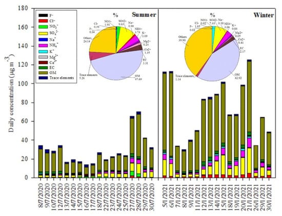 In this study, organic mass (OM), a key component of PM2.5, was calculated from the OC measured at the sampling site by multiplying the concentration of OC with a factor to account for the presence of oxygen and hydrogen atoms. According to [34], a factor of 1.6 ± 0.2 was recommended for urban areas worldwide [35,36]. Since there is currently no data reported for urban areas in Vietnam, the value of 1.6 was selected for the present study. The OM concentrations estimated for the summer and winter periods were 18.97 ± 10.28 µg m−3 and 51.34 ± 20.42 µg m−3 which accounted for 47.70% and 42.92% of the PM2.5 total mass, respectively (Figure 3). This suggested that OM is one of the predominant species in ambient air in Hanoi City. However, it should be noted that adopting the factor of 1.6 to estimate the fraction of OM in the measured PM2.5 could present some uncertainties. It is recommended that those uncertainties should be addressed in the future studies.
