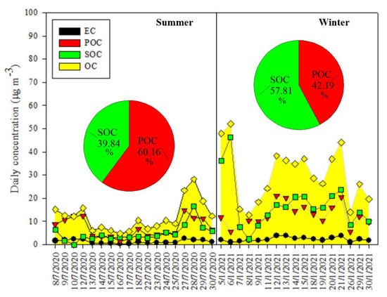 Daily variation of EC, OC, POC, and SOC concentration for the summer and winter periods.
