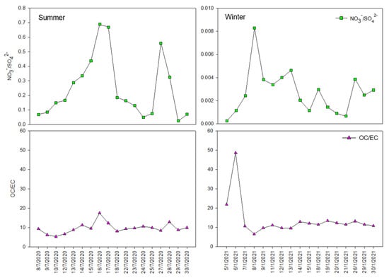 Daily variation of NO3−/SO42− and OC/EC mass ratio for the summer and winter periods.