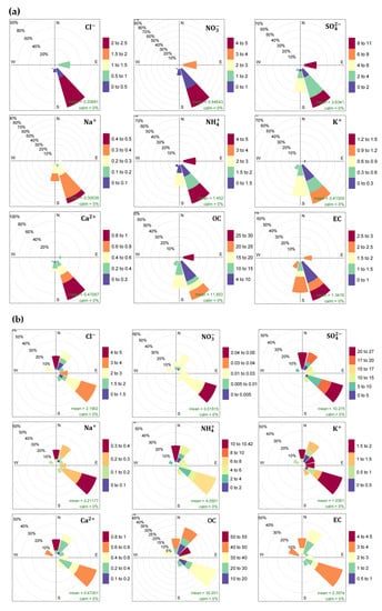 In order to identify the possible impact of the distant sources located in the provinces near Hanoi, the relationship between wind direction and concentration of key chemical compositions in PM2.5 was explored. During the summer period, the southeast wind was the most prevailing wind sector, followed by the south and east winds (Figure 6a). The highest concentrations of Cl−, NO3−, Na+, K+, Ca2+, and EC were corresponding to the southeast wind. Meanwhile, SO42− and NH4+ reached their highest concentrations with respect to both the southeast and east winds, which suggested the common sources for these species during the summer period. The elevated concentrations of OC corresponded to the east wind. There are many large industrial sources (cement, steel, and coal-fired power plants) situated in the northern, eastern, and southern provinces near Hanoi (Figure 1). Thus, under certain meteorological conditions in the summer period, wind could bring air pollutants released from those sources towards the study area in Hanoi and contribute to the elevated concentrations of PM2.5 and its chemical components. Meanwhile, the dominant winds in the winter period were the southeast, northeast, and north winds (Figure 6b). The high concentrations of Cl−, NH4+, and Ca2+ were related to the north wind. Meanwhile, the highest concentration of NO3– were associated with the southeast wind which was quite similar to that in the summer period. The highest concentrations of SO42− and Na+ were found with both the southeast and north winds. K+ showed its diverse source regions in the winter period, where its highest concentrations were seen more frequently with the southeast wind, followed by the north, northeast, and east winds. The highest concentrations of OC and EC were seen with the northeast and southeast winds, respectively. From these results, it could be inferred that in addition to the southeast wind, either the north or northeast winds might partly contribute to the increased concentration of PM2.5 in the winter period via the transport of air pollutants released from the regional sources to the study area. In summary, the change in seasonal wind directions, and subsequently the change in the source regions, could influence the variation of concentration of PM2.5 and its major species in the study area.