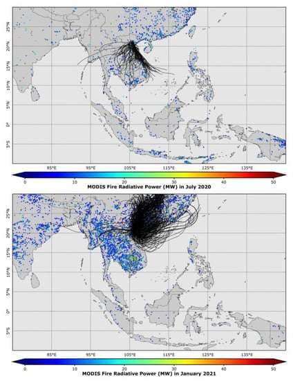 MODIS cumulative fire radiative power over the Southeast Asian region and three-day air mass backward trajectories (indicated by the black curves) arrived at the sampling site in Hanoi during the summer period (July 2020) and winter period (January 2021).