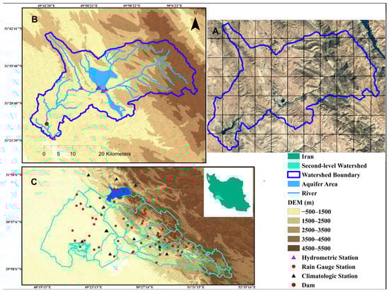 The study region with its hydro-climatic stations, alluvial aquifer, and DEM. In more detail, plot A is satellite imagery of the watershed provided by Google Earth, demonstrating different land coverage. Plot B represents the topographical variations in the watershed along with the location of dams, hydrometric stations, aquifers, and rivers. Plot C illustrates a second-level watershed containing the study domain with climatologic stations.