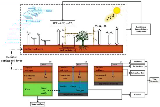 The schematic connections and the components of the model are shown in Figure 2. According to the proposed model, Equations (1) and (2) describe the system governing the water and energy balance.