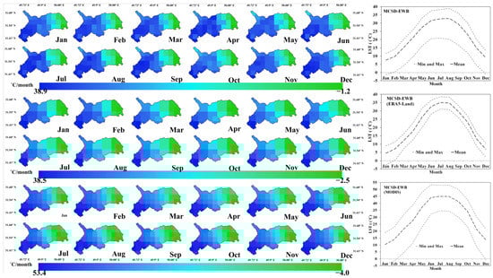 Spatiotemporal patterns of long-term monthly average values of LST (°C) based on MCSD-EWB, MCSD-EWB (ERA5-Land), and MCSD-EWB (MODIS) models.