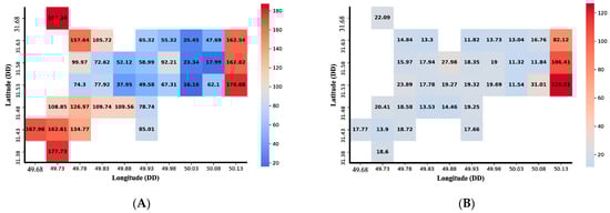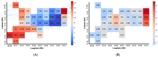 Spatial patterns of the MAE metric (°C) between monthly EEBT and LST simulated by: (A) MCSD-EWB (MODIS) (B) MCSD-EWB (ERA5-Land) models.