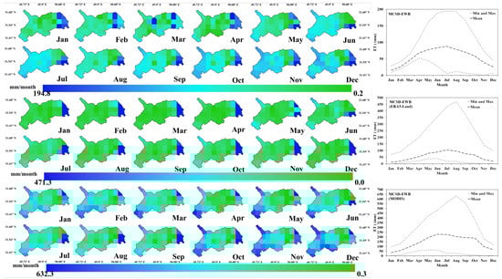 Spatiotemporal changes in long-term monthly average of ET (mm) based on MCSD-EWB, MCSD-EWB (ERA5-Land), and MCSD-EWB (MODIS) models.