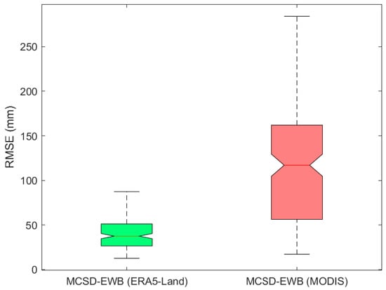 Figure 5 shows the boxplots of the RMSE metric associated with the monthly EEBT values compared to LST results of the MCSD-EWB (ERA5-Land) and MCSD-EWB (MODIS) models. Accordingly, the minimum, maximum, and median RMSE for the MCSD-EWB (ERA5-Land) and MCSD-EWB (MODIS) models are 2.17, 5.42, and 3.85 °C and 3.80, 14.79, and 9.86 °C, respectively. Similar to the MAE results, the results for the EEBT are in better agreement with the LST of the MCSD-EWB (ERA5-Land) model than with that of the MCSD-EWB (MODIS) model.
