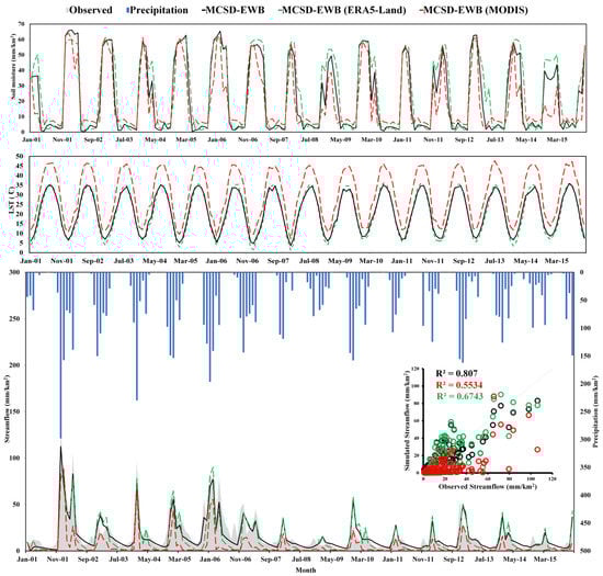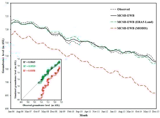 According to the results, the performance of the MCSD-EWB and MCSD-EWB (ERA5-Land) models was found to be better than that of the MCSD-EWB (MODIS) model in simulating LST, streamflow, and aquifer levels versus the observed values. The temporal variations in streamflow and aquifer levels simulated by the MCSD-EWB and MCSD-EWB (ERA5-Land) models were in a suitable agreement with the observed time series, while the MCSD-EWB (MODIS) model underestimated the streamflow compared with the observations. This is primarily due to the estimation accuracy of ET, which is affected by the LST results. The LST achieved by the ERA5-Land dataset and MCSD model is more accurate than MODIS LST because the LST retrieval method is based on energy balance closure, which is a physical approach.